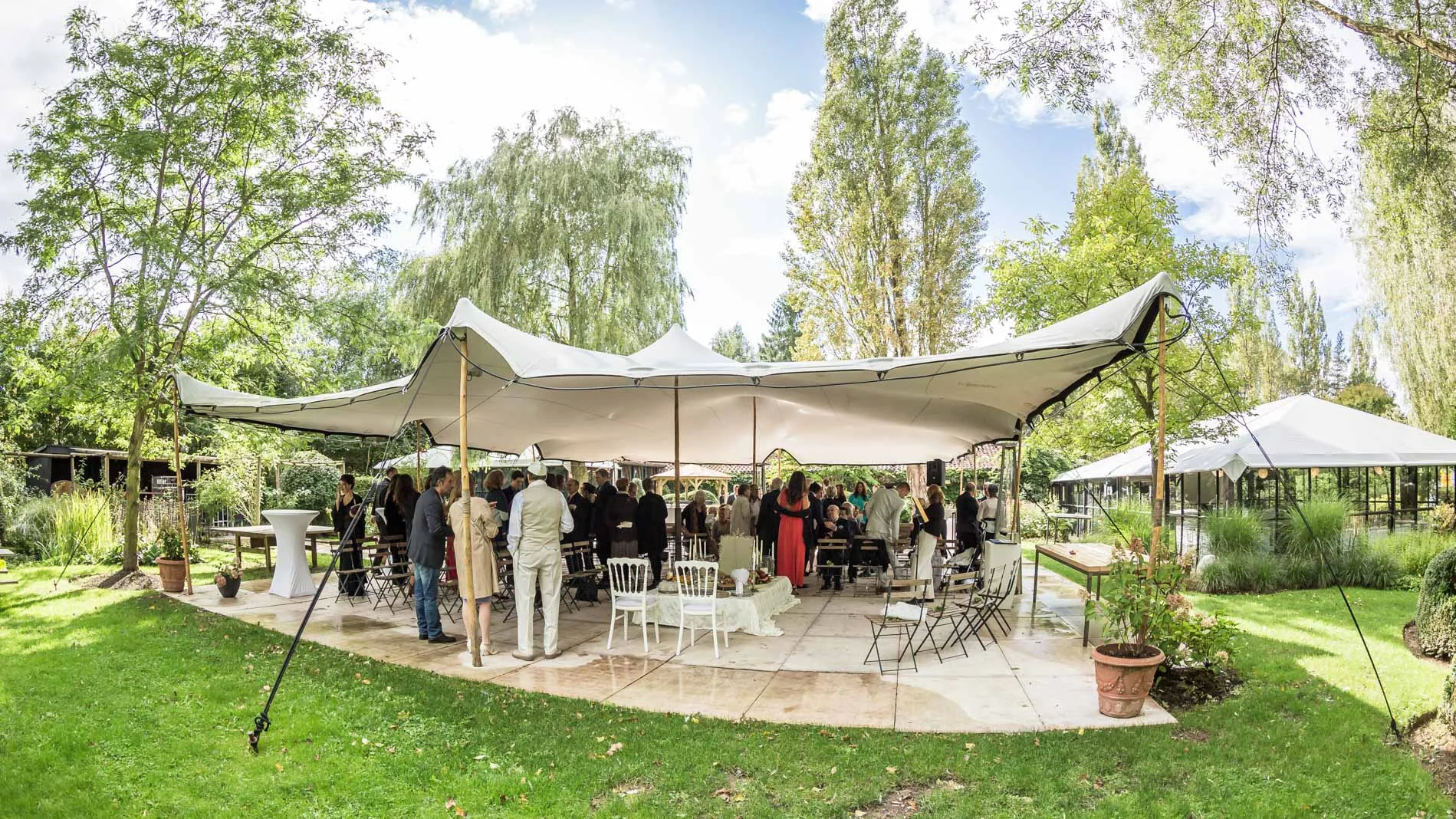 Cérémonie en plein air sous une grande tente blanche dans un jardin verdoyant avec des invités en costume et robe élégante.